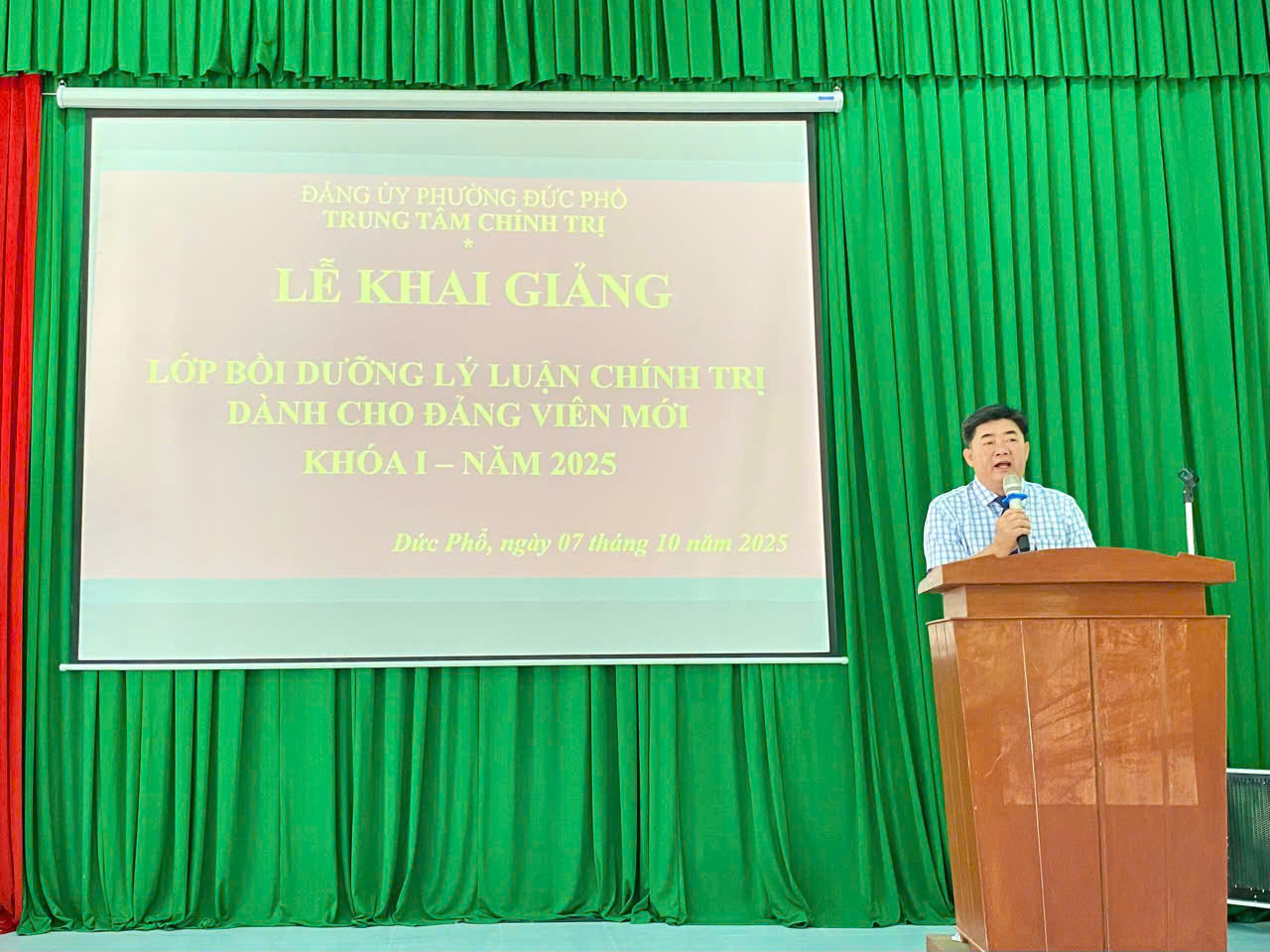 Sáng ngày 07/10/2025, Trung tâm Chính trị phường Đức Phổ phối hợp với các cơ quan, đơn vị tổ chức khai giảng Lớp bồi dưỡng lý luận chính trị dành cho đảng viên mới. Về dự Lễ khai giảng có đồng chí Lê Văn Bình, Phó Bí thư Thường trực Đảng ủy phường Đức Phổ; các đồng chí đại diện lãnh đạo Ban Xây dựng Đảng Đảng ủy các xã, phường: Sa Huỳnh, Khánh Cường và Nguyễn Nghiêm; cùng các đồng chí lãnh đạo, giảng viên, viên chức Trung tâm Chính trị phường Đức Phổ.