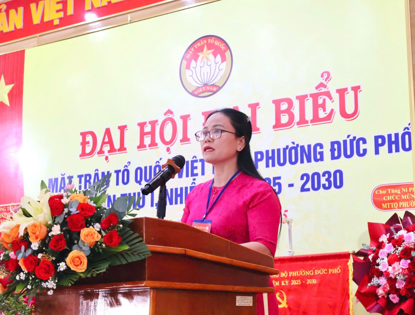 Phát biểu chỉ đạo đại hội, Ủy viên Ban Thường vụ Tỉnh ủy, Phó Chủ tịch Thường trực Ủy ban MTTQ Việt Nam tỉnh Y Thị Bích Thọ đánh giá cao những kết quả đạt được trên các lĩnh vực của phường Đức Phổ trong nhiệm kỳ qua. Đồng thời, đề nghị Ủy ban MTTQ Việt Nam phường Đức Phổ tiếp tục củng cố, mở rộng và tăng cường khối đại đoàn kết toàn dân tộc. Nâng cao chất lượng công tác giám sát và phản biện xã hội; thực hiện tốt quy chế dân chủ ở cơ sở; phát huy vai trò của nhân dân trong việc tham gia xây dựng Đảng, chính quyền trong sạch, vững mạnh. Tiếp tục đổi mới nội dung, phương thức vận động nhân dân. Phát huy tinh thần thi đua yêu nước, ý chí tự lực, tự cường và khát vọng phát triển, góp phần xây dựng phường Đức Phổ giàu đẹp, văn minh, nghĩa tình.
