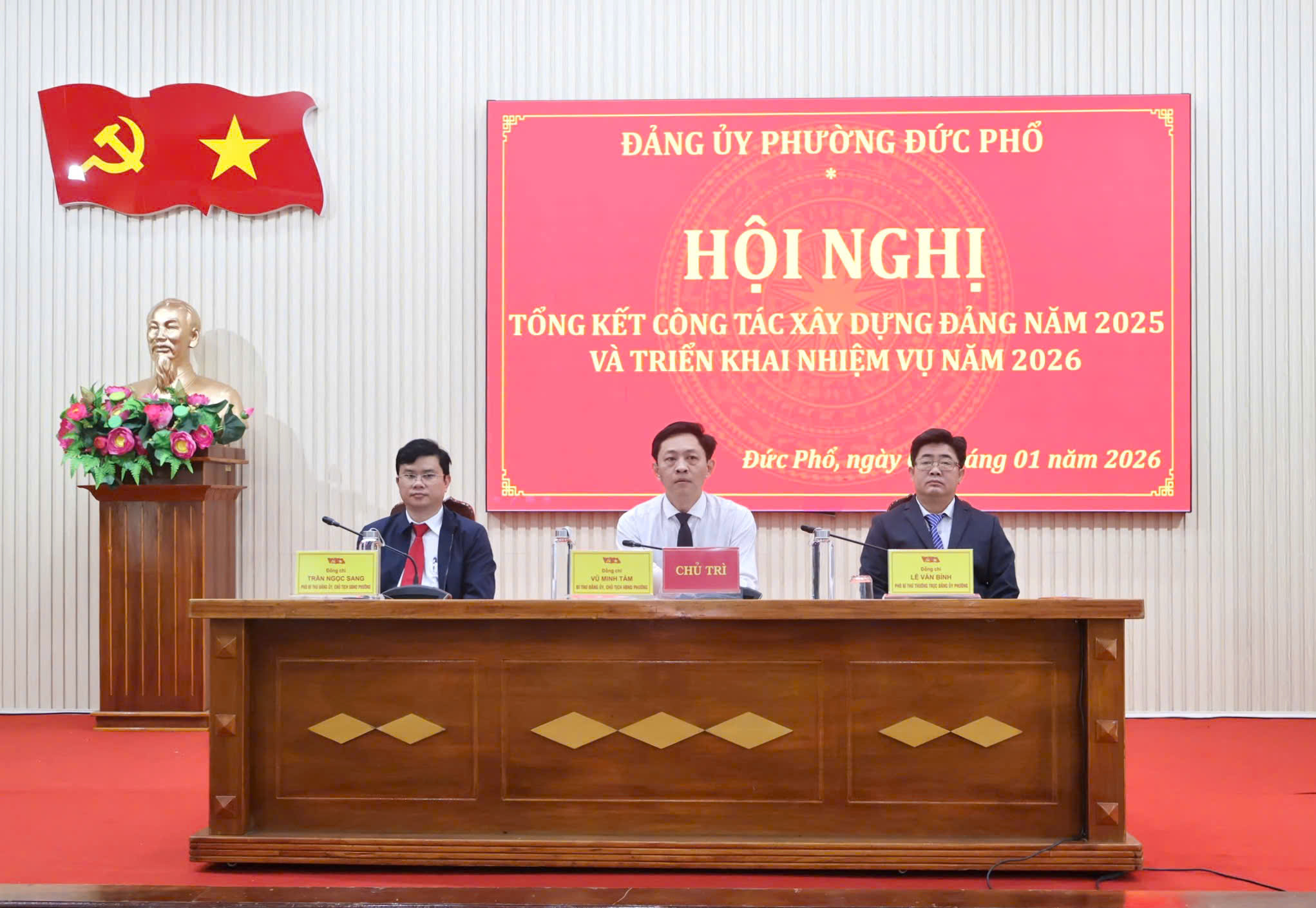 Chiều ngày 09/01/2026, Đảng ủy phường Đức Phổ tổ chức Hội nghị tổng kết công tác xây dựng Đảng năm 2025 và triển khai nhiệm vụ trọng tâm năm 2026. Đồng chí Vũ Minh Tâm, Bí thư Đảng ủy, Chủ tịch HĐND phường; đồng chí Lê Văn Bình, Phó Bí thư Thường trực Đảng ủy và đồng chí Trần Ngọc Sang, Phó Bí thư Đảng ủy, Chủ tịch UBND phường đồng chủ trì Hội nghị.