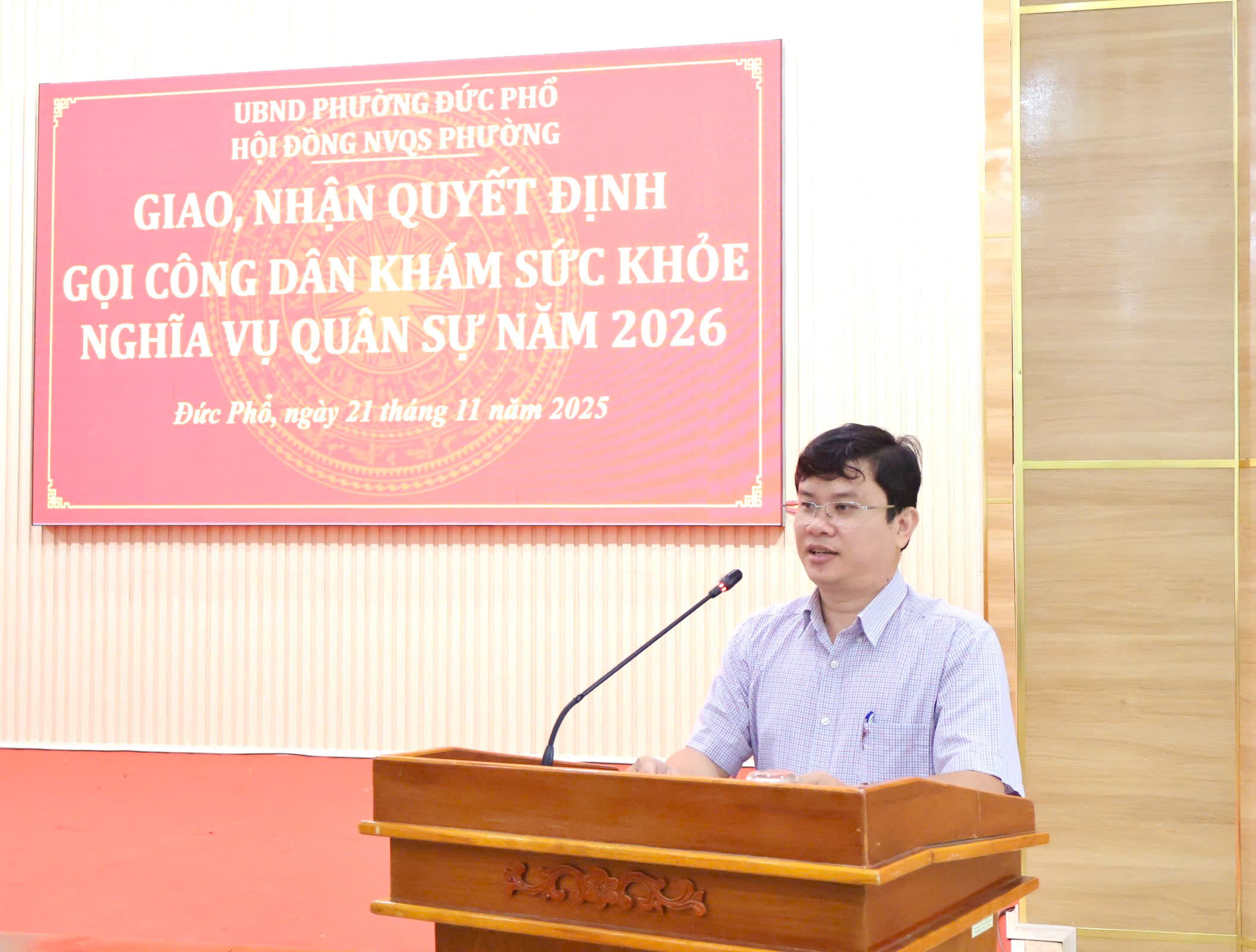 Sáng ngày 21/11/2025, Hội đồng nghĩa vụ quân sự phường Đức Phổ tổ chức giao quyết định gọi khám sức khỏe nghĩa vụ quân sự cho công dân đủ điều kiện gọi khám sức khỏe nghĩa vụ quân sự năm 2026.
