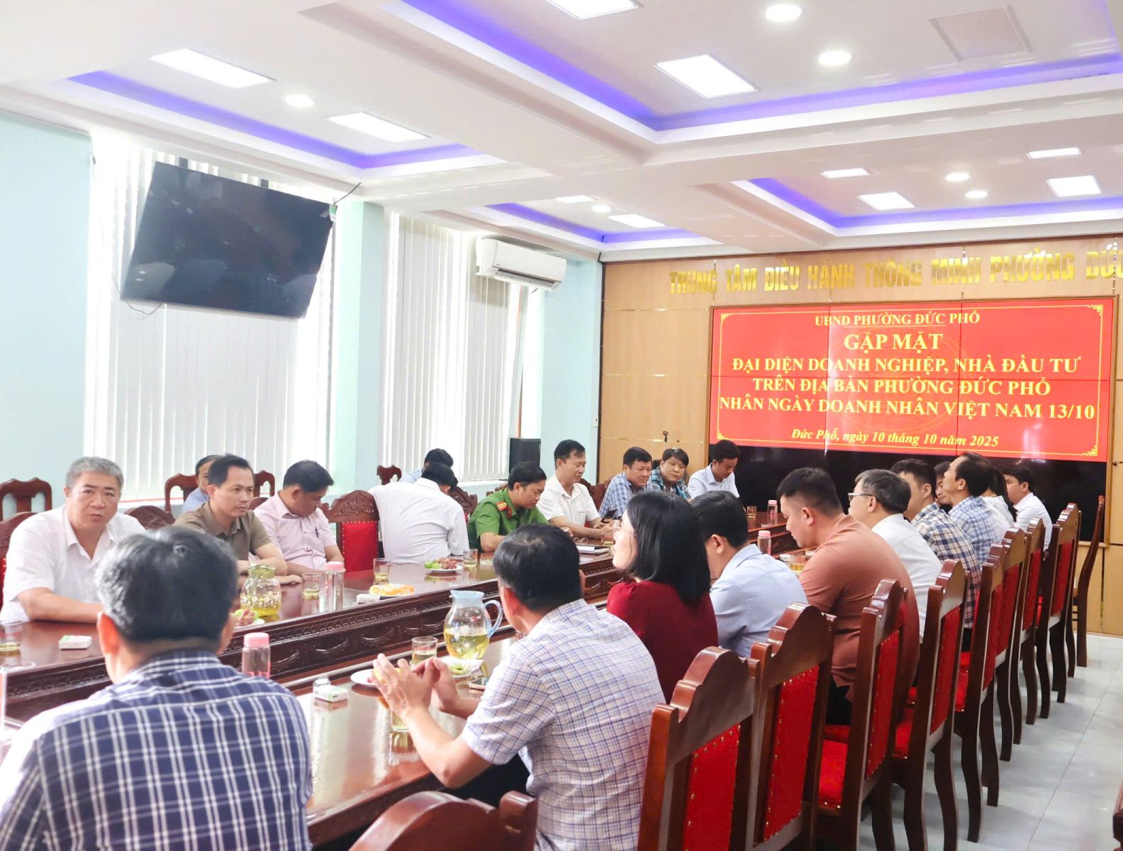 Nhân kỷ niệm 21 năm Ngày Doanh nhân Việt Nam (13/10/2004-13/10/2025), UBND phường Đức Phổ tổ chức Hội nghị gặp mặt doanh nghiệp, nhà đầu tư năm 2025. Tham dự hội nghị có đồng chí Lê Văn Bình, Phó Bí thư Thường trực Đảng uỷ; đồng chí Trần Ngọc Sang, Phó Bí thư Đảng ủy, Chủ tịch UBND phhường; đồng chí Trà Thị Lệ, Phó Chủ tịch HĐND phường; đại diện Ban Thường trực Ủy ban MTTQ Việt Nam phường; đại diện lãnh đạo các phòng, ban, cơ quan, đơn vị và các doanh nghiệp, nhà đầu tư trên địa bàn phường.