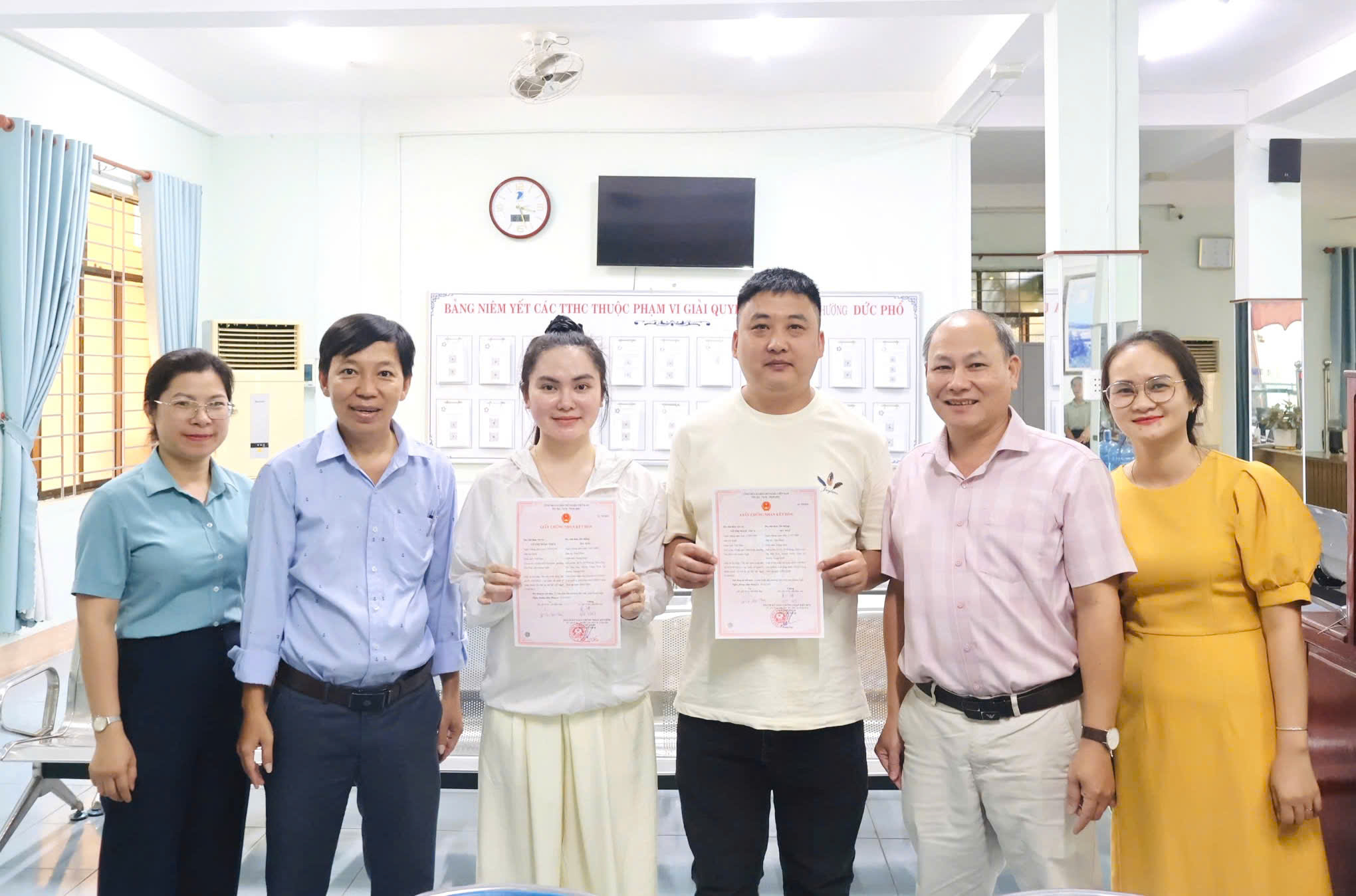 Ngày 10/10/2025, UBND phường Đức Phổ đã trao giấy chứng nhận kết hôn cho chị Võ Thị Ngọc Thúy, thường trú tại TDP Vĩnh Bình, phường Đức Phổ và anh Wu Wei, quốc tịch Trung Quốc. Việc trao giấy kết hôn có yếu tố nước ngoài tại đơn vị đánh dấu bước chuyển giao về thủ tục hành chính trong triển khai mô hình chính quyền hai cấp và cải cách thủ tục hành chính.